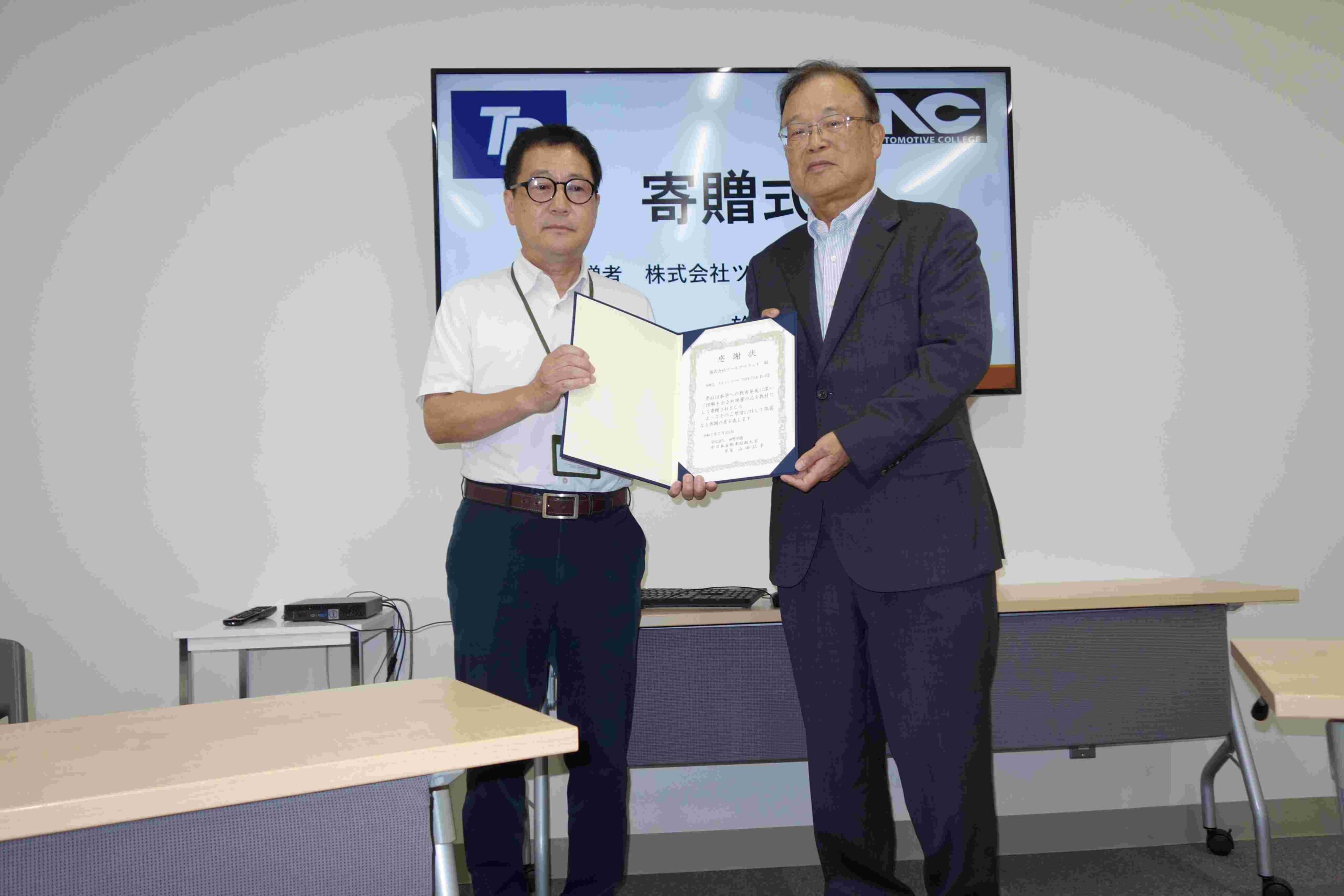 自動車用故障診断機の製造・販売を手がけるツールプラネット(岐阜市、浅野一信 社長)は、加茂郡坂祝町の中日本自動車短期大学(山田弘幸 学長)と高山市の高山自動車短期大学(坂井歩 学長)の2校に、スキャンツール(故障診断装置)各5台と充電器1台、総額160万円相当をそれぞれ寄贈した。(写真=中日本自動車短大での寄贈式)