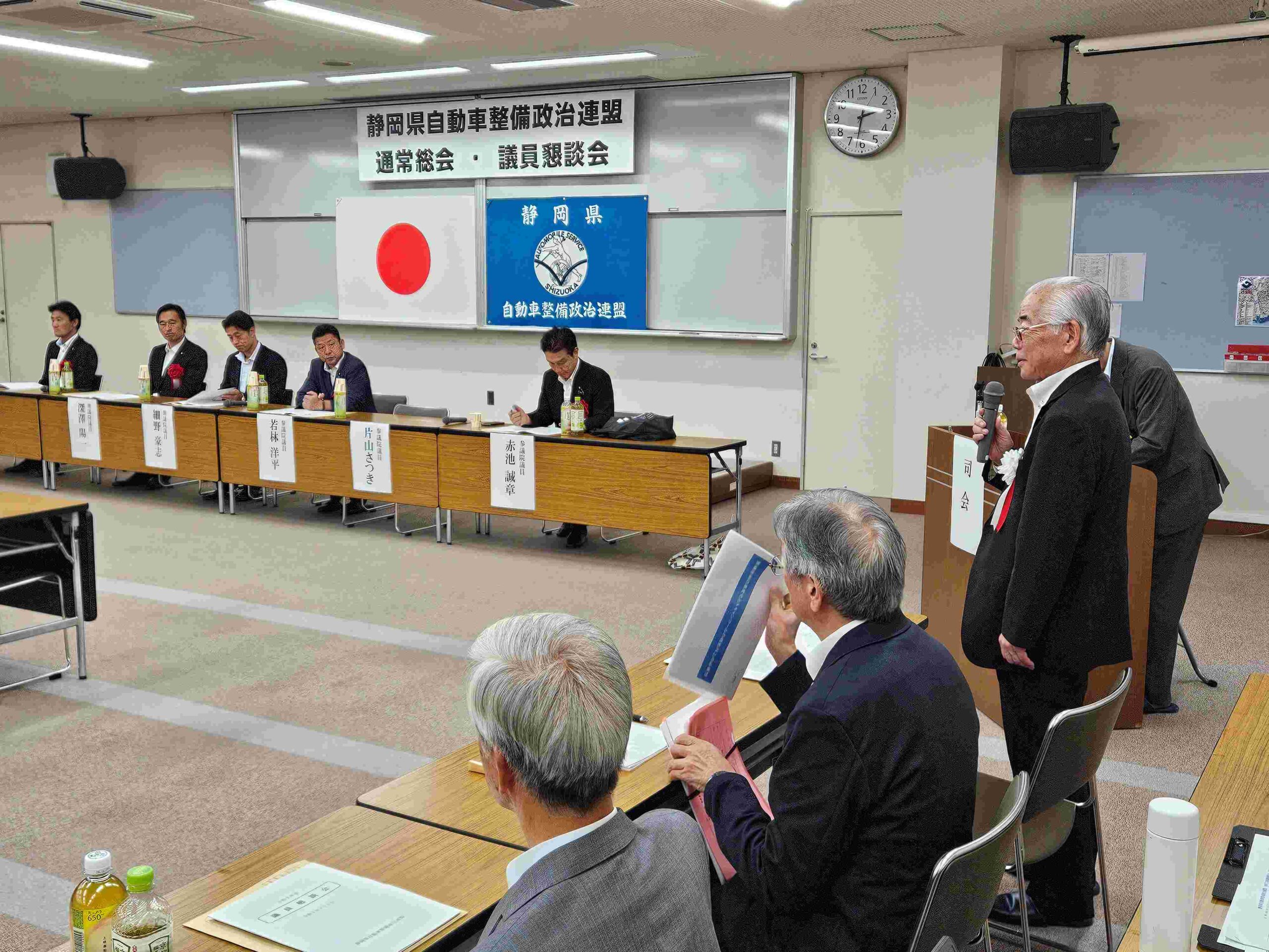 整備業界の中でも活発な政治活動を展開している静岡県自動車整備政治連盟(杉山智彦 会長)は、7月5日、静岡市駿河区の整備振興会総合会館で通常総会(写真)を開催した。議事終了後には、県選出の国会議員を招いた懇談会が開かれ、活発な意見交換が行われた。