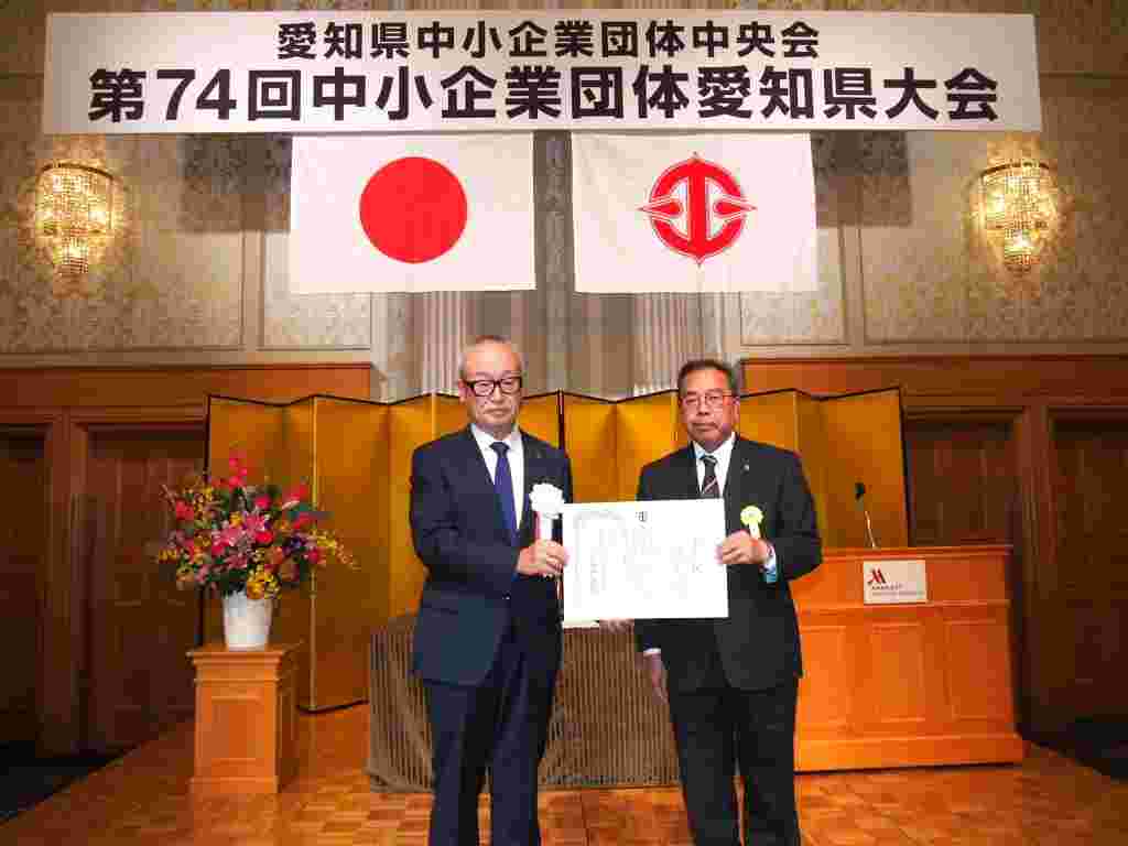 愛知県中小企業団体中央会(山口高広 会長)は10月23日、名古屋マリオットアソシアホテルで「第74回中小企業団体愛知県大会」を開催した。表彰式では、愛知県中小企業団体中央会会長賞として、組合功労者57人、組合永年勤続優良職員24人を表彰。このうち、中央会会長賞では、愛知県東部自動車整備協同組合の伊藤友二理事長が組合功労者代表として山口会長から表彰状を授与された。(写真)