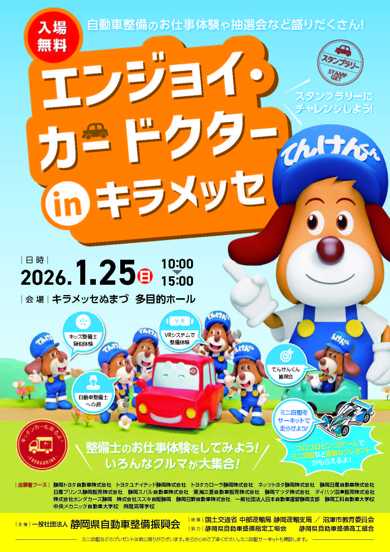 静岡県自動車整備振興会(杉山智彦 会長)は令和8年1月25日、沼津市大手町の「キラメッセぬまづ」多目的ホールで、人材確保事業の一環として子ども向けイベント「エンジョイ・カードクターinキラメッセ」(チラシ)を開催する。