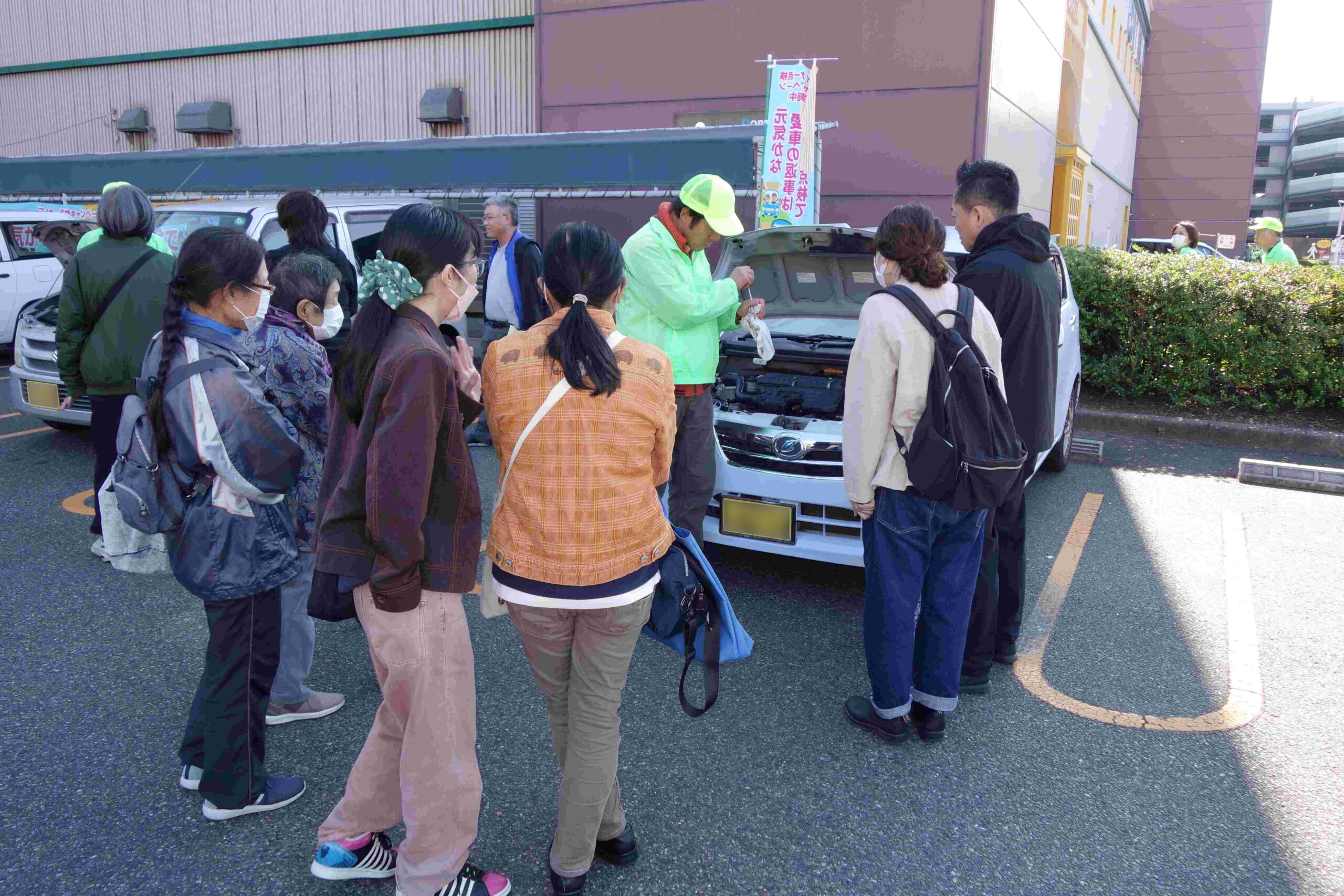 愛知県自動車整備振興会(川村保憲 会長)の港支部(鈴木護 支部長)は11月16日、名古屋市港区のショッピングセンター「アピタ港店」駐車場でマイカー点検教室(写真)を開催した。