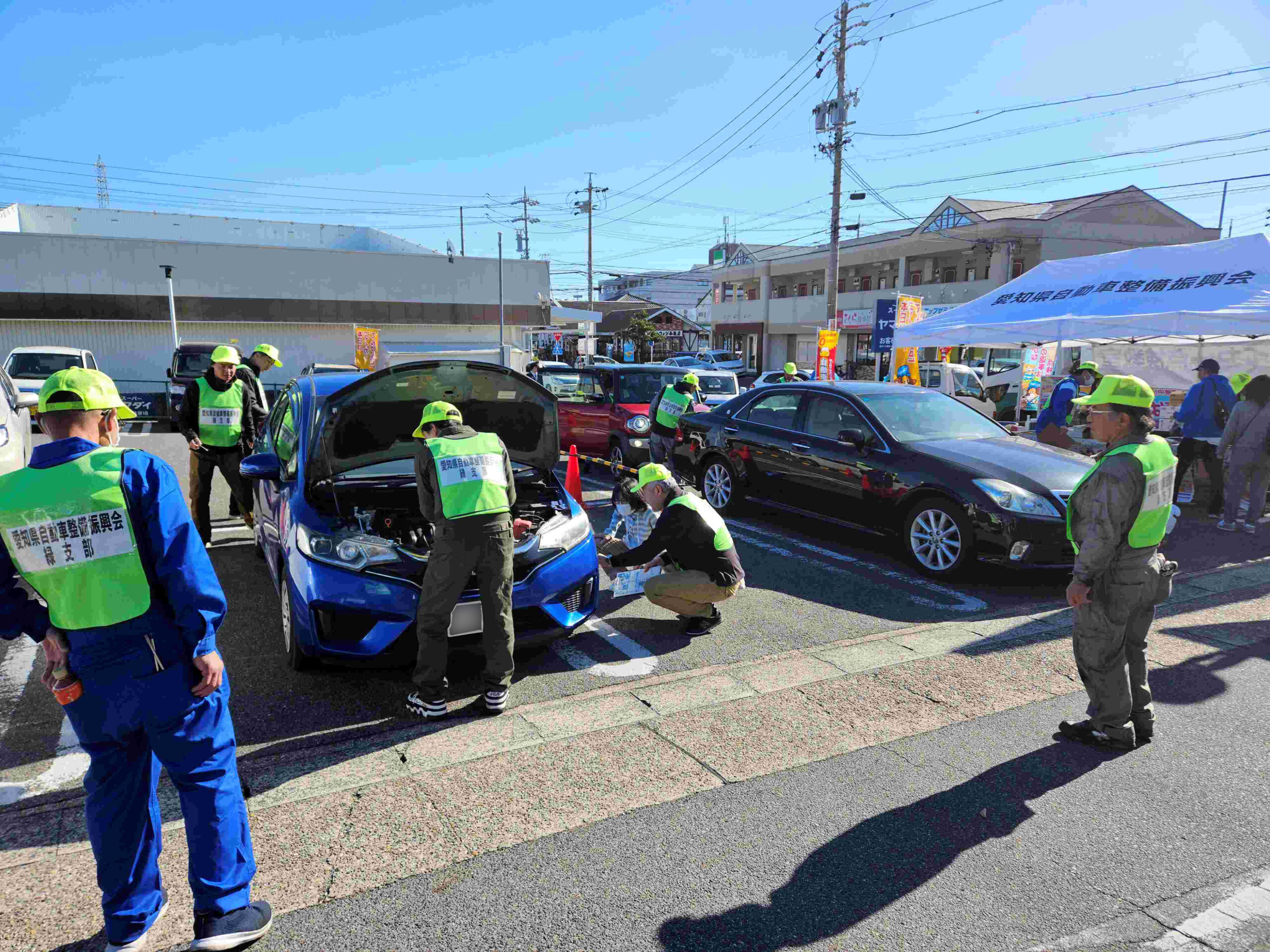 愛知県自動車整備振興会(川村保憲 会長)の緑支部(一江兼広 支部長)は11月22日、名古屋市緑区のスーパーヤマダイうばこ店の駐車場でマイカー無料点検(写真)を実施した。