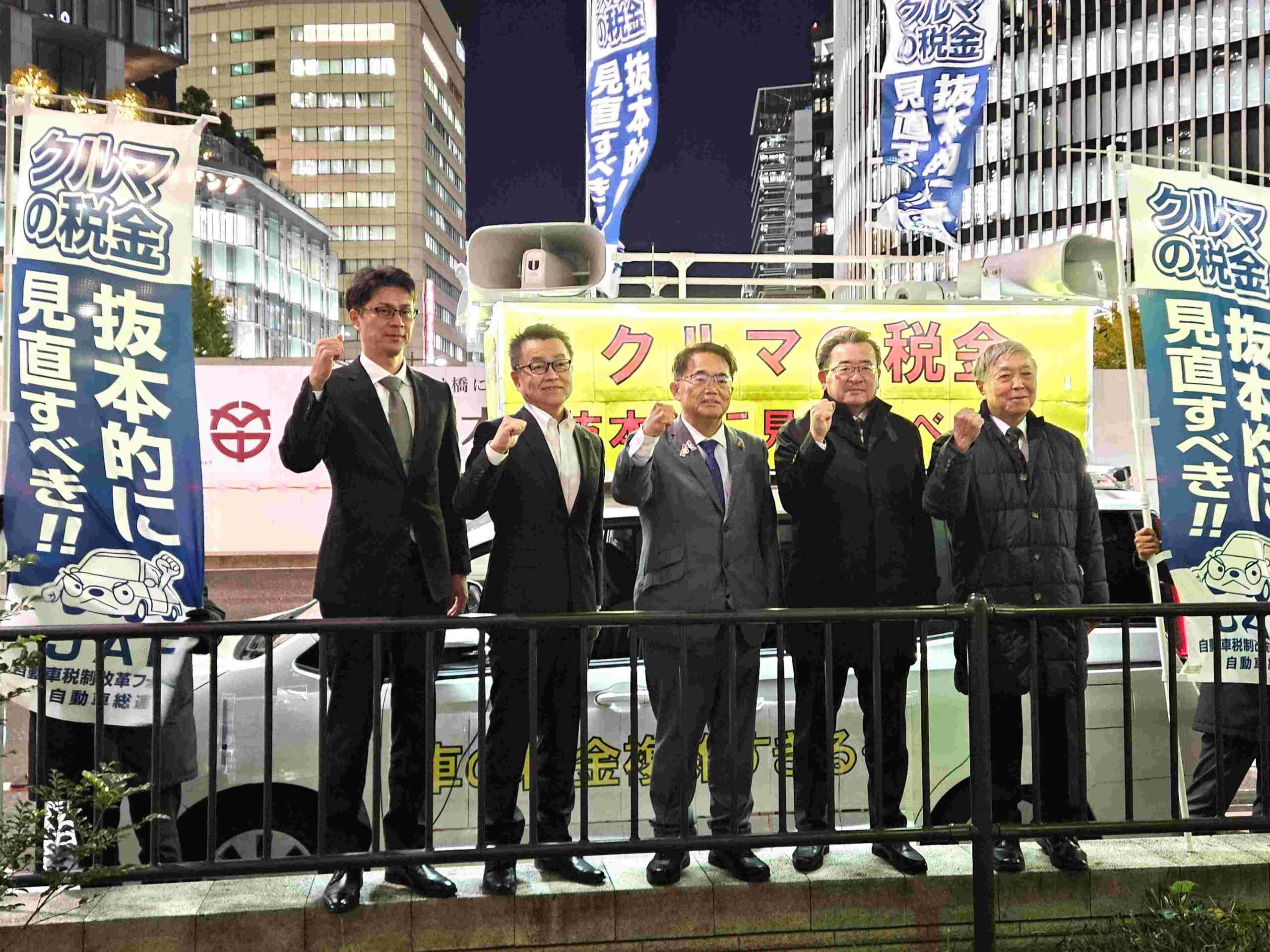 自動車ユーザーの視点から、自動車重量税の廃止など税制改革の実現を求めるため、日本自動車連盟(JAF)愛知支部、日本自動車販売協会連合会(自販連)愛知県支部・愛知県自動車販売店協会、愛知県自動車会議所、全日本自動車産業労働組合連合会(自動車総連)愛知地方協議会など自動車関係団体は12月5日、名古屋駅前で「自動車税制の抜本的見直しに関する街頭アピール」(写真)を実施した。